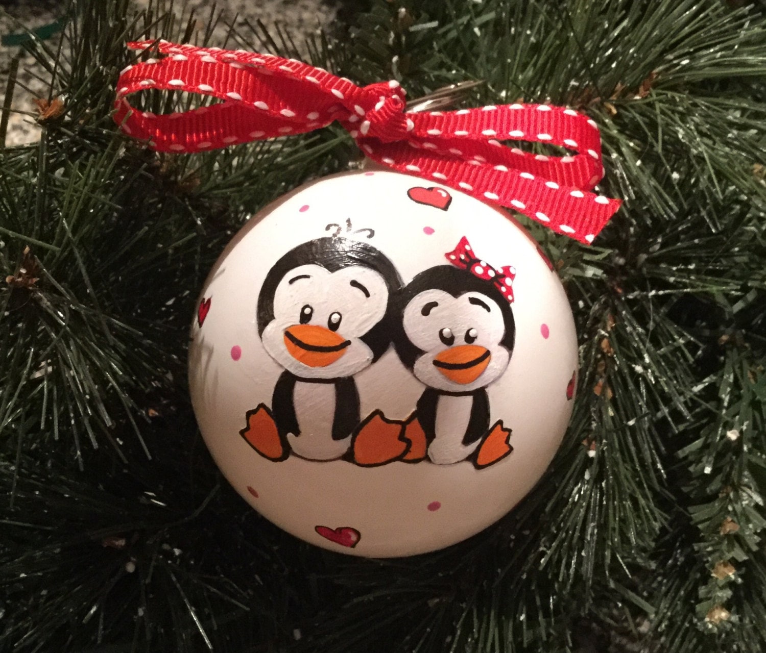 This 2.75" white glass ornament features an adorable penguin couple and would make the perfect gift for any couple. Can be personalized on the back at no additional cost. Comes ready to hang. This ornament will become a truly unique treasure for years to come. Each ornament comes in a gift box with matching ribbon and bow, making a great gift for someone special.