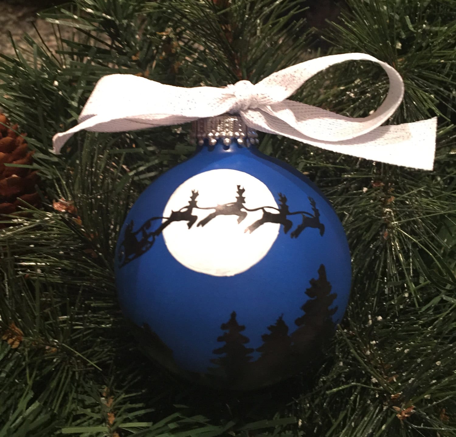 This glass ornament measures 67mm and features Santa Claus and his reindeer over the tree tops on Christmas eve. The back can be personalized at no additional cost with a name and the year. Ornament shown with "Merry Christmas" personalization. This ornament will become a truly unique treasure for years to come. Comes ready to hang. Each ornament comes in a gift box with matching ribbon and bow, making a great gift for someone special.
