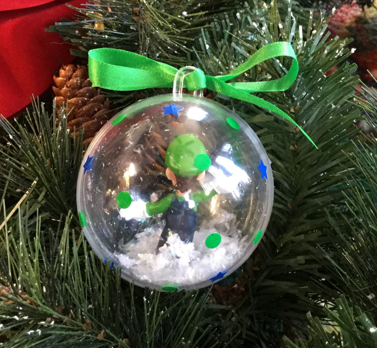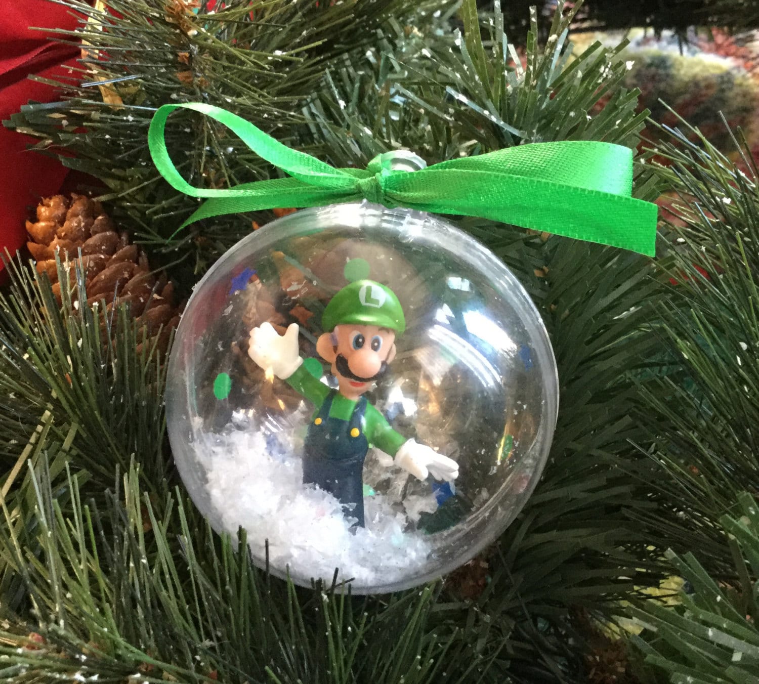 This 3" (80mm) clear, shatterproof snap-together ornament features Luigi from Super Mario Bros. and has artificial iridescent snow inside. The ornament is glued together. Comes ready to hang and can be personalized on the back at no additional cost. Each ornament comes in a gift box with matching ribbon and bow, making a great gift for someone special.