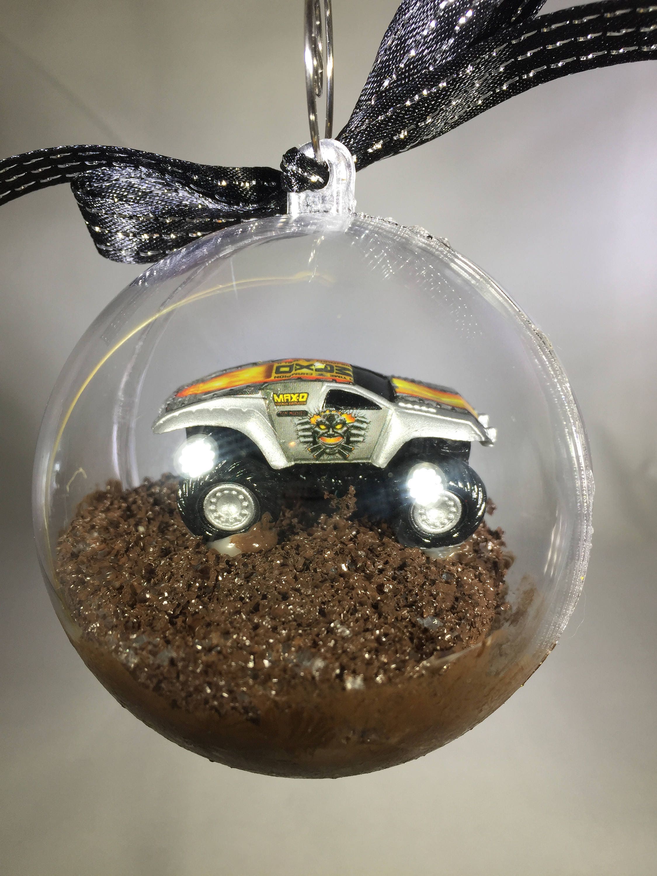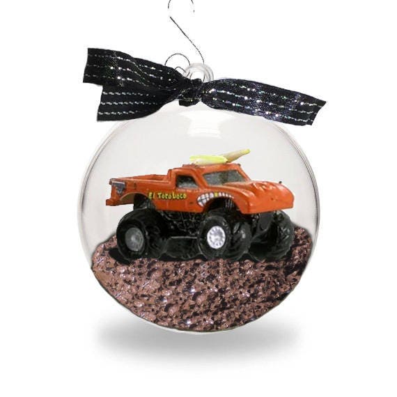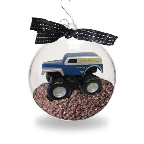 These clear, shatterproof snap-together ornaments measure approximately 2.25" and each features a different Monster Jam truck. Decorate your tree with these ornaments that depict the miniature version of the popular Monster Jam racing trucks. Great for any monster jam fan. One each, your choice: Son-Uva Digger, El Toro Loco, Maximum Destruction, Grave Digger the Legend, and Monster Mutt. The back can be personalized at no additional cost.
