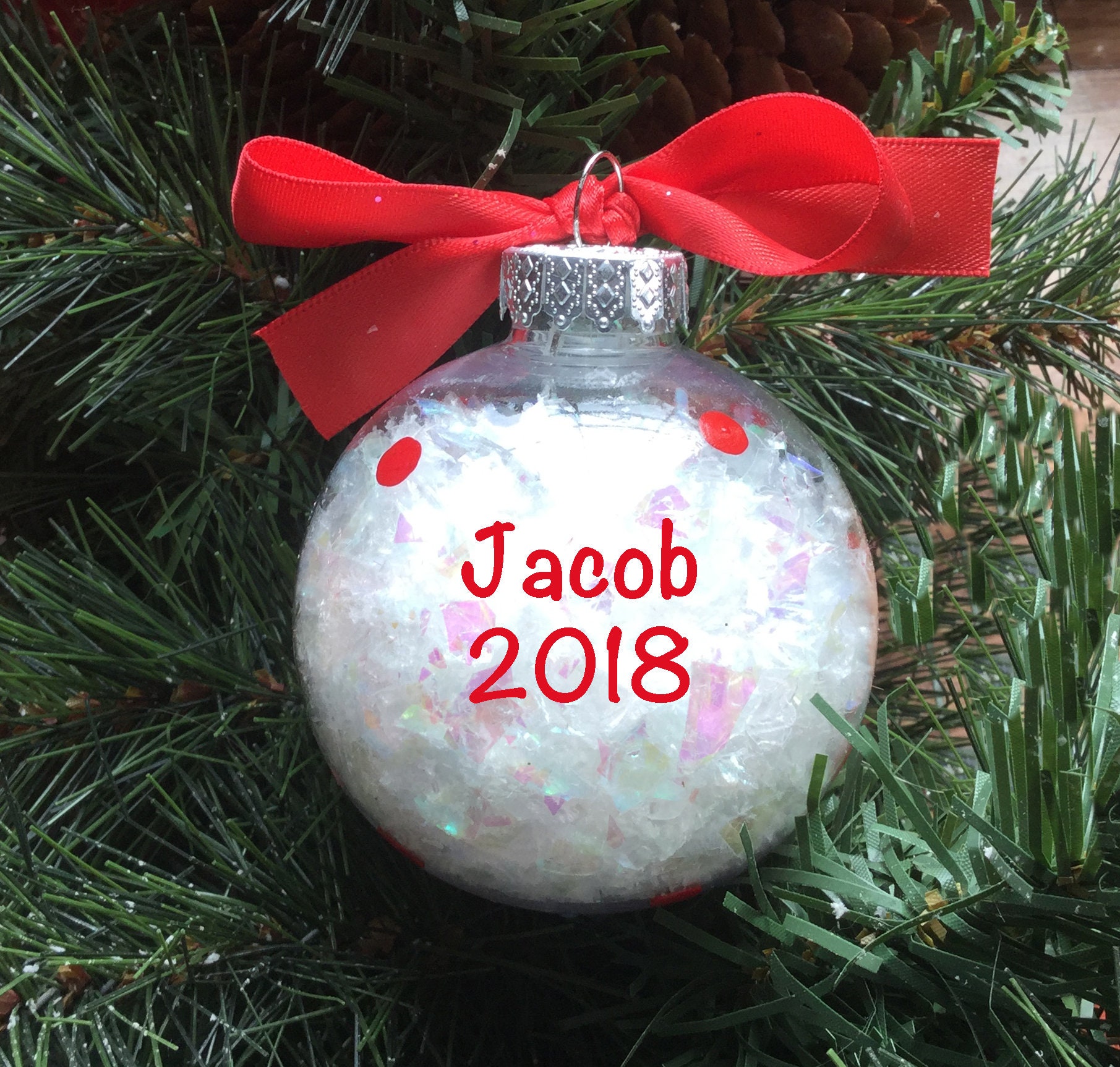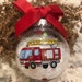 This personalized fire truck ornament would make a great keepsake. The 67mm clear, shatterproof ornament is filled with iridescent snow and has a hand painted fire truck on the front with red dots all around. Can be personalized on the back at no additional cost. Ornament comes ready to hang.